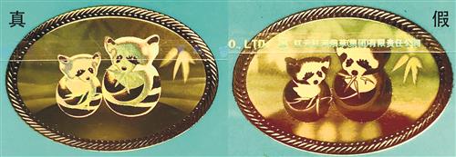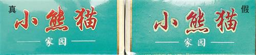 正面文字差異對(duì)比:真煙“小熊貓”字樣字體較粗,字形渾厚有力,凸起明顯,燙金緊湊均勻;假煙“小熊貓”字樣字體較細(xì),似連似斷,凸起不明顯,邊緣燙金較寬。