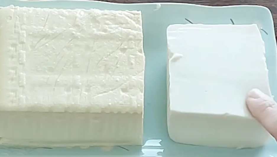 二摸傳統(tǒng)豆腐用手按壓可感受到彈性,且軟硬適度。人工合成的豆腐切面處會(huì)比較粗糙,質(zhì)地不細(xì)膩,彈性較差,且沒(méi)有白色的豆腐液體流出。