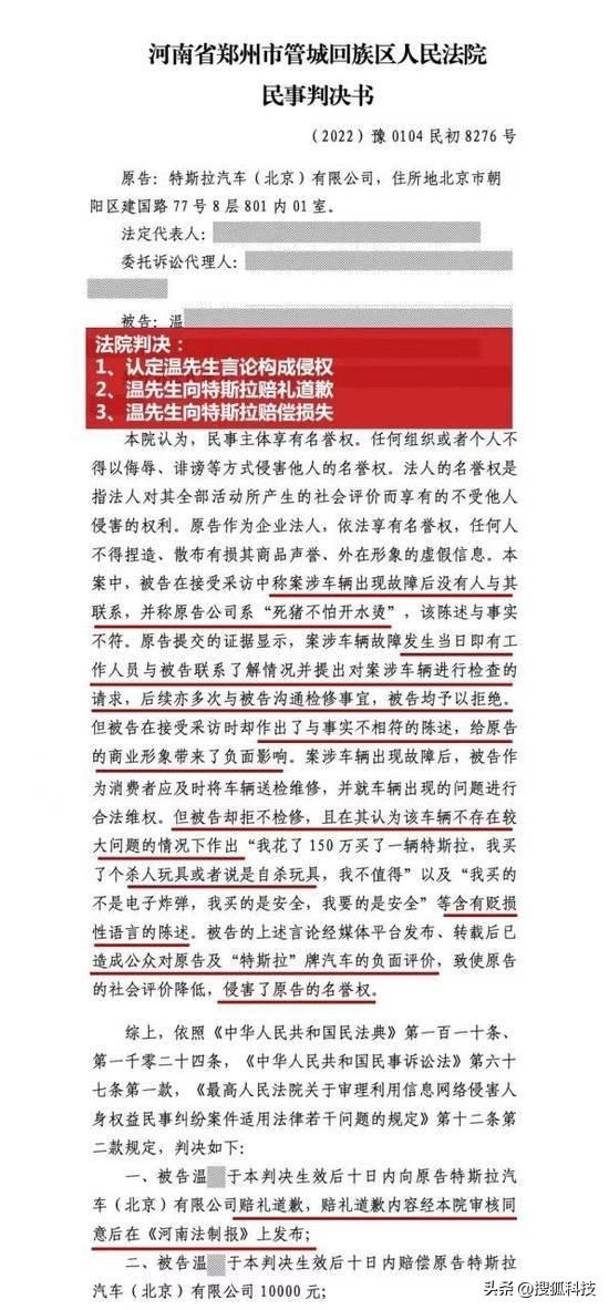 11月15日消息,近日,特斯拉起訴河南溫姓車主一案宣判。河南省鄭州市管城回族區(qū)人民法院認(rèn)定,溫先生的言論侵害了特斯拉汽車(北京)公司的名譽(yù)權(quán)。法院判決,溫先生需在《河南法制報(bào)》上向特斯拉公開道歉,并支付賠償款1萬元。