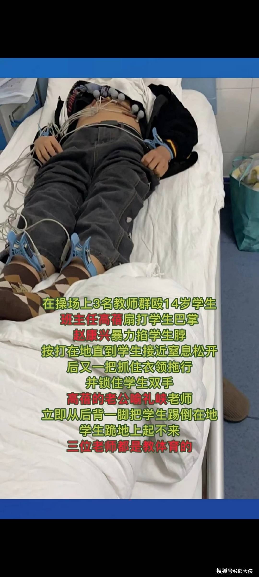 在操場上3名教師群毆14歲學(xué)生,班主任高蓓扇打?qū)W生巴掌,趙康興暴力掐學(xué)生脖子,按打在地直到學(xué)生接近室息松開后又一把抓住衣領(lǐng)拖行并鎖住學(xué)生雙手,高蓓的老公喻禮峽老師立即從后背一腳把學(xué)生踢倒在地,學(xué)生跪地上起不來,三位老師都是教體育的。