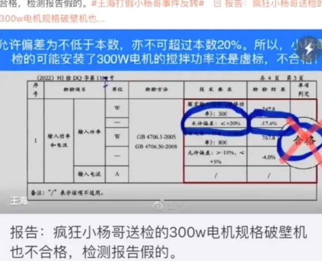 11月21日,王海再發(fā)文質疑瘋狂小楊哥此前公布的質檢報告。王海稱,瘋狂小楊哥送檢的300w電機規(guī)格破壁機也不合格,檢測報告假的,并舉報合肥產(chǎn)品質量監(jiān)督檢驗研究院涉嫌出具不實、虛假報告。對此,合肥產(chǎn)品質量監(jiān)督檢驗研究院相關工作人員稱,是嚴格按照國家相關標準進行檢測的,研究院對出具的檢測報告也是負責的。