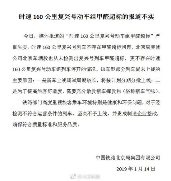 中國鐵路北京局表示,時(shí)速160公里復(fù)興號(hào)列車不存在甲醛超標(biāo)問題,北京局集團(tuán)公司北京車輛段也從未檢測(cè)出復(fù)興號(hào)列車甲醛超標(biāo),更不存在時(shí)速160公里復(fù)興號(hào)動(dòng)車組列車停開的情況。該車型部分列車尚未上線的主要原因:一是新車上線調(diào)試周期較長(zhǎng),將按計(jì)劃分期分批上線;二是為了提高旅客舒適度,需要充分散發(fā)新車揮發(fā)物(俗稱新車氣味)。