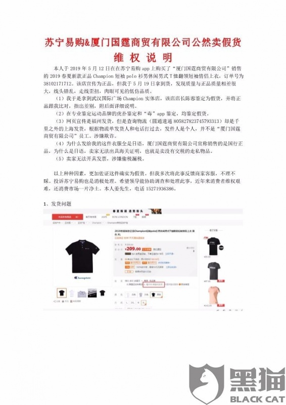 消費(fèi)者“葫蘆娃吖820”在5月22日向黑貓投訴平臺(tái)反映:“尊敬的領(lǐng)導(dǎo),媒體朋友: 本人于2019年5月12日在在蘇寧易購app上購買了一件Champion短袖polo衫男休閑男式T恤,訂單號(hào)為38102171***。蘇寧易購宣傳為正品,但我于5月19日拿到貨,發(fā)現(xiàn)質(zhì)量與正品質(zhì)量相差很大,線頭錯(cuò)亂,走線歪扭,明顯可見的低仿品質(zhì),因?yàn)槲矣卸嗉撈放埔路?并不是第一次購買。?
