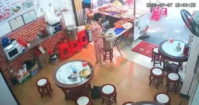 當(dāng)天下午3時(shí)許,這名女子第二次將不明液體倒入湯鍋后,在店內(nèi)坐了不到5分鐘便戴口罩離店。監(jiān)控中,詹先生母親喊她付錢,女子稱“給了現(xiàn)金”便離開(kāi)了。同日下午3時(shí)55分許,男顧客到店喝湯時(shí)發(fā)現(xiàn)異樣,又坐在粉裙女子坐過(guò)的餐桌上吃飯,食用了桌上的調(diào)料,引發(fā)不適。