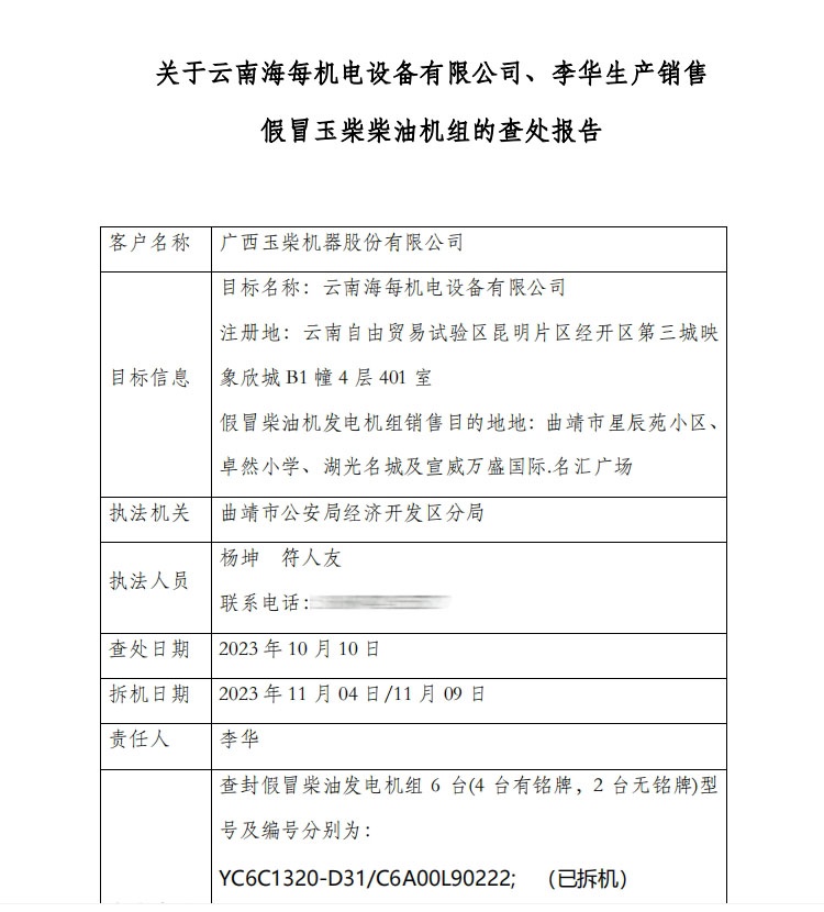 廣西打假案例,柴油機發(fā)電機組打假,廣西玉柴機器股份有限公司