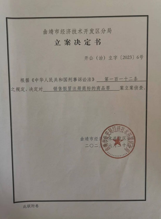 2023 年 7 月 27 日正式?jīng)Q定以銷售假冒注冊商標(biāo)的商品罪予以立案偵查。立