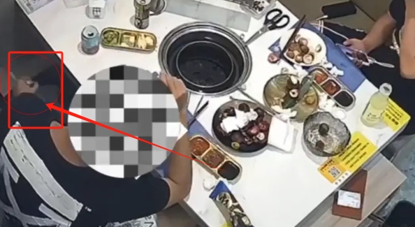 店內(nèi)監(jiān)控視頻顯示,戴眼鏡小伙用餐過(guò)程中,有用手往下塞東西的動(dòng)作。