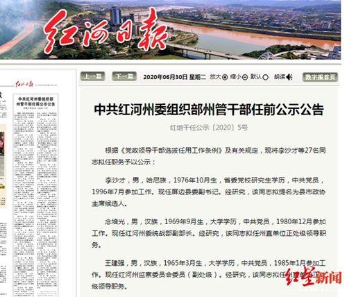 紅星新聞?dòng)浾咦⒁獾?,《紅河日?qǐng)?bào)》6月30日刊發(fā)的《中共紅河州委組織部州管干部任前公示公告》(紅組干任公示〔2020〕5號(hào)),公示的27名擬任名單中,念培光的介紹為,“男,漢族,1969年9月生,大學(xué)學(xué)歷,中共黨員,1980年12月參加工作。現(xiàn)任紅河州委統(tǒng)戰(zhàn)部副部長(zhǎng)。經(jīng)研究,該同志擬任州直單位正處級(jí)領(lǐng)導(dǎo)職務(wù)?!?br>