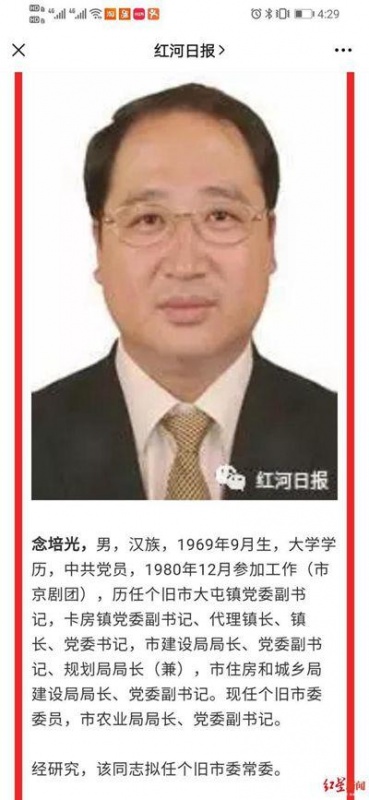 另?yè)?jù)《紅河日?qǐng)?bào)》微信公眾號(hào)2016年12月19日發(fā)布的《中共紅河州委組織部州管干部任前公示公告》(紅組干任公示〔2016〕9號(hào)),其中關(guān)于念培光履歷更為詳盡,“歷任個(gè)舊市大屯鎮(zhèn)黨委副書(shū)記,卡房鎮(zhèn)黨委副書(shū)記、代理鎮(zhèn)長(zhǎng)、鎮(zhèn)長(zhǎng)、黨委書(shū)記,市建設(shè)局局長(zhǎng)、黨委副書(shū)記、規(guī)劃局局長(zhǎng)(兼),市住房和城鄉(xiāng)局建設(shè)局局長(zhǎng)、黨委副書(shū)記?,F(xiàn)任個(gè)舊市委委員,市農(nóng)業(yè)局局長(zhǎng)、黨委副書(shū)記。經(jīng)研究,該同志擬任個(gè)舊市委常委?!?br>
