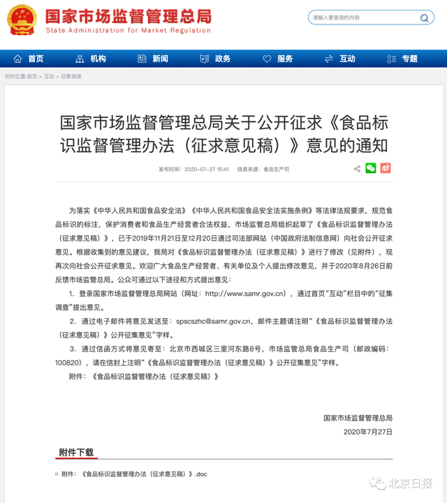 近日,《食品標識監(jiān)督管理辦法(征求意見稿)》在國家市場監(jiān)管總局網(wǎng)站上公開征求意見,其中規(guī)定: