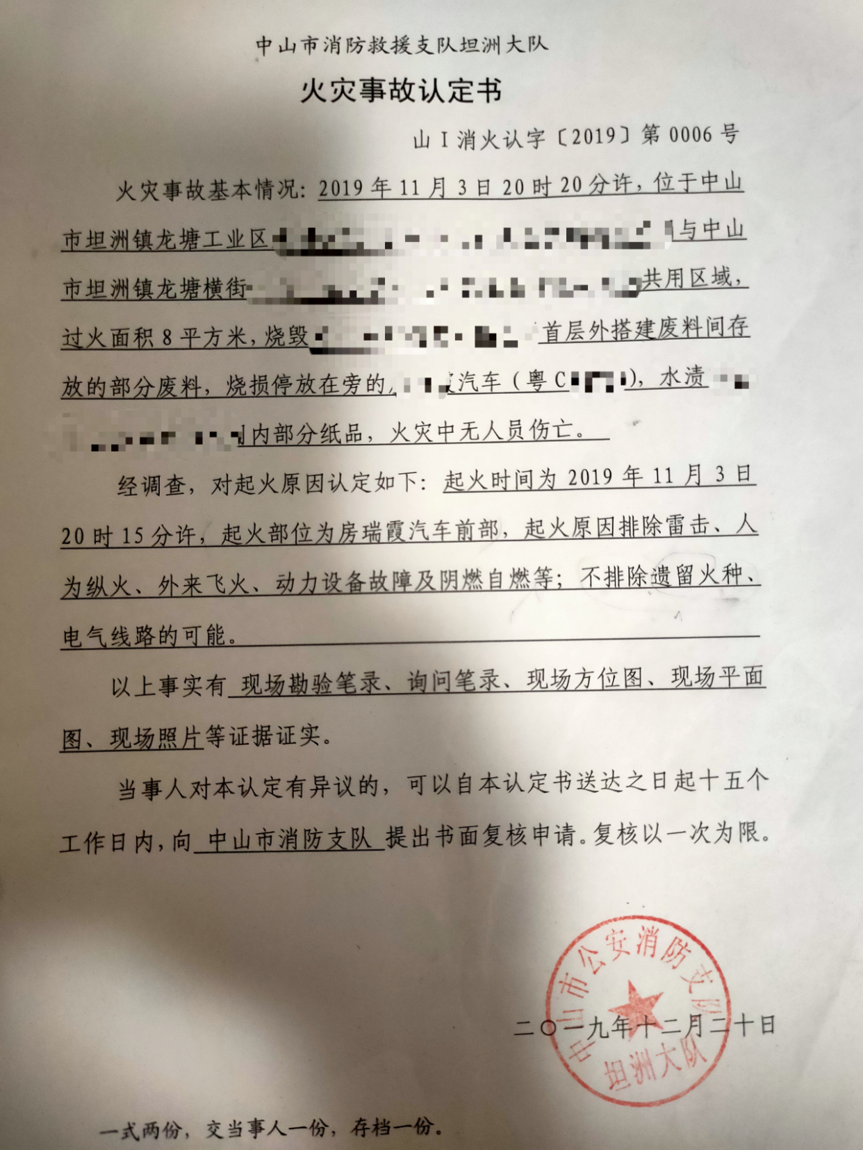 12月20日,中山市消防救援支隊坦洲大隊出具了火災事故認定書,指出“起火部位為汽車前部,起火原因排除雷擊、人為縱火、外來飛火、動力設備故障及陰燃自燃等”“不排除遺留火種,電氣線路的可能”。