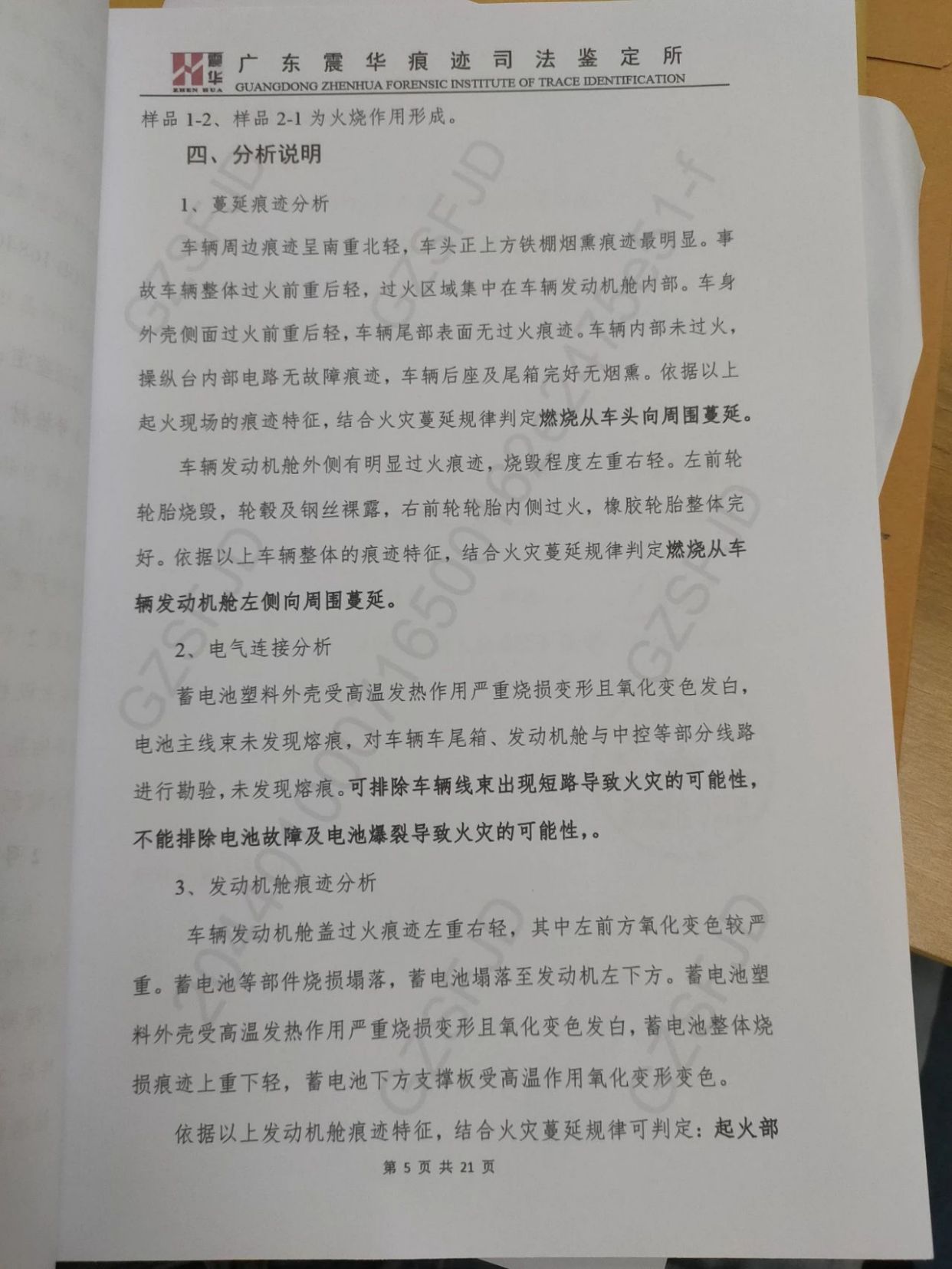 然而,第三方鑒定機構卻對汽車起火原因給出了截然相反的結論。今年6月,廣東震華痕跡司法鑒定所出具了關于房女士汽車起火原因的司法鑒定書,鑒定書指出“燃燒從車輛發(fā)動機艙左側向周圍蔓延”,鑒定起火原因為“發(fā)動機艙左側蓄電池因老化等因素導致內(nèi)部故障,整體過熱燃燒,從而導致火災?!?/p>