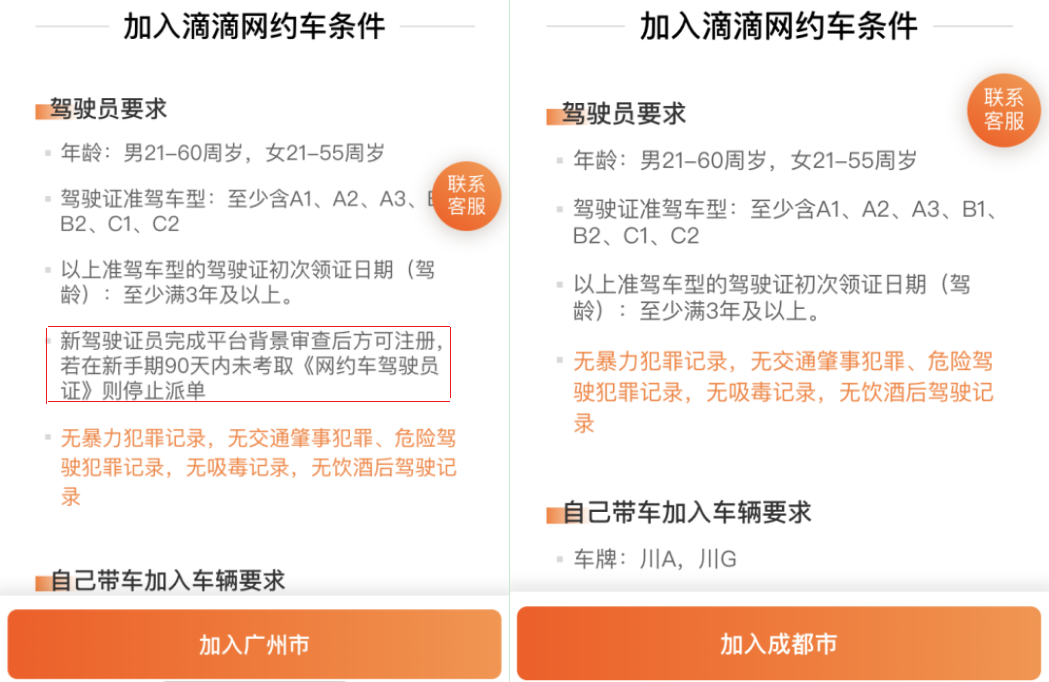 但滴滴對司機是否具備“雙證”(網(wǎng)約車運輸證和網(wǎng)約車駕駛員證)沒有作統(tǒng)一要求,而是因城市而異。例如,要加入廣州市的滴滴,滴滴要求新駕駛員完成平臺背景審查后方可注冊,若在新手期90天內(nèi)未考取《網(wǎng)約車駕駛員證》則停止派單。而加入成都市的滴滴則沒有這項要求。