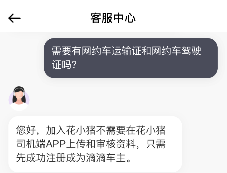 值得一提的是,花小豬此前曾被爆出“沒有強調(diào)司機必須有雙證(網(wǎng)約車運輸證和網(wǎng)約車駕駛員證)”。在花小豬平臺(司機端)里,記者詢問客服是否需要雙證,客服沒有正面回答,只是表示需先成功注冊成為滴滴車主。