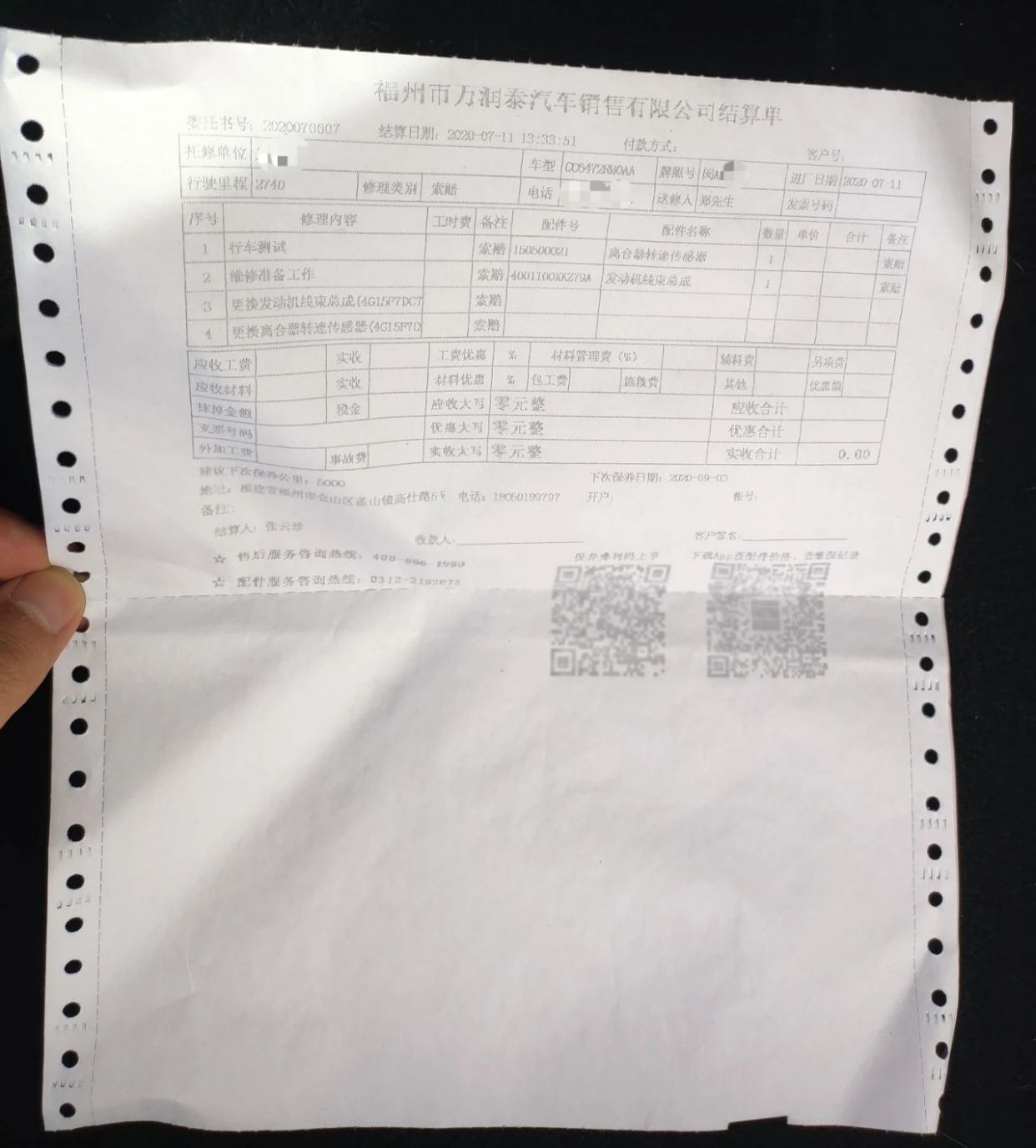 鄭先生提供的維修單據(jù)顯示,4S店為汽車更換了新的離合器轉(zhuǎn)速傳感器,以及安裝了新的發(fā)動(dòng)機(jī)線束總成。除此之外,4S店還并向鄭先生賠償1000元的誤工費(fèi)用。