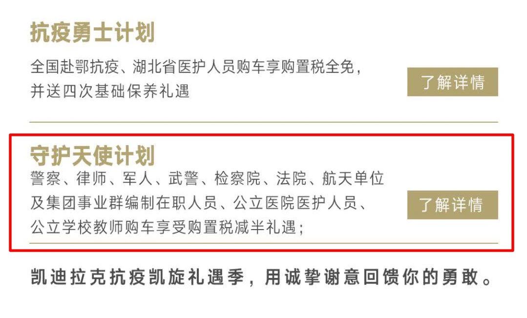 牛女士參加的優(yōu)惠活動,是上汽通用凱迪拉克品牌在今年4月8日推出的“抗疫凱旋禮遇季”活動,有效期至今年6月30日,其中的“守護(hù)天使計劃”規(guī)定,公立醫(yī)院醫(yī)護(hù)人員可以獲得購置稅減半的優(yōu)惠。