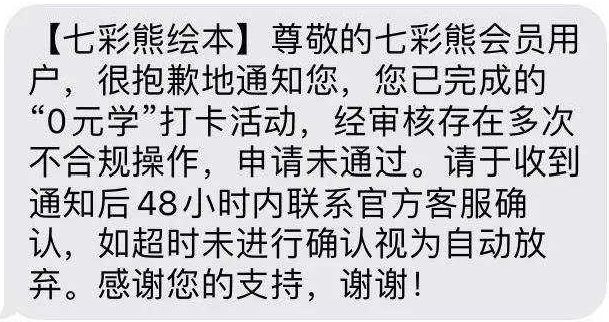 據(jù)家長們反映,對于某些完成306天全部打卡任務(wù)的用戶,“七彩熊”又會增加障礙,告知用戶打卡不合規(guī),審核不通過。家長們認為,這是以各種理由變相拒絕消費者的返現(xiàn)請求。