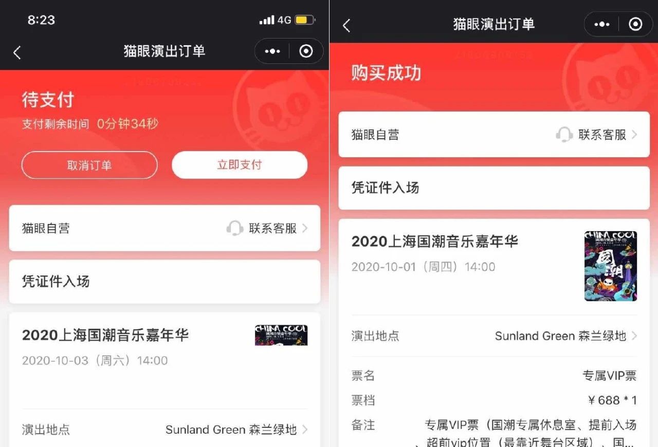 左:待支付頁面的門票時(shí)間為10月3日,右:購買訂單的門票時(shí)間為10月1日