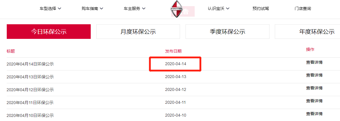 ▲寶沃汽車最新的環(huán)保數(shù)據(jù)停留在4月14日(來源:寶沃汽車官方網(wǎng)站)