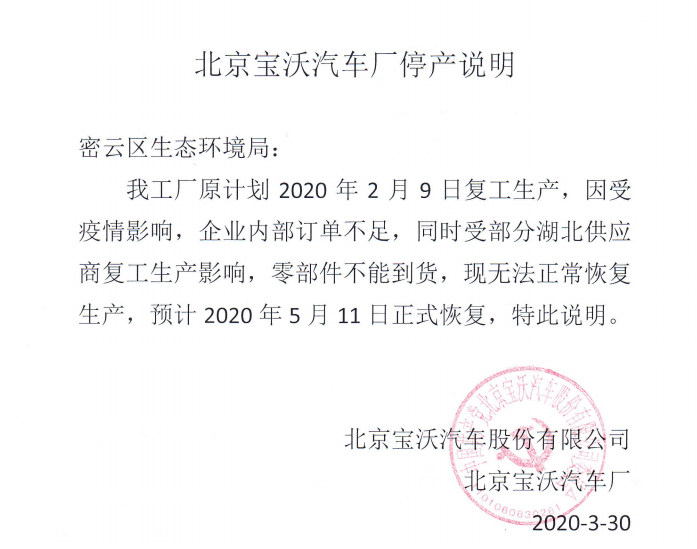北京市企業(yè)事業(yè)單位環(huán)境信息公開平臺(tái)上的一份《北京寶沃汽車廠停產(chǎn)說明》指出:“因受疫情影響,企業(yè)內(nèi)部訂單不足,同時(shí)受部分湖北供應(yīng)商復(fù)工生產(chǎn)影響,零部件不能到貨,現(xiàn)無法正?;謴?fù)生產(chǎn),預(yù)計(jì)2020年5月11日正式恢復(fù)”。換言之,在今年5月11日之前,寶沃汽車工廠都將處于停產(chǎn)狀態(tài)。