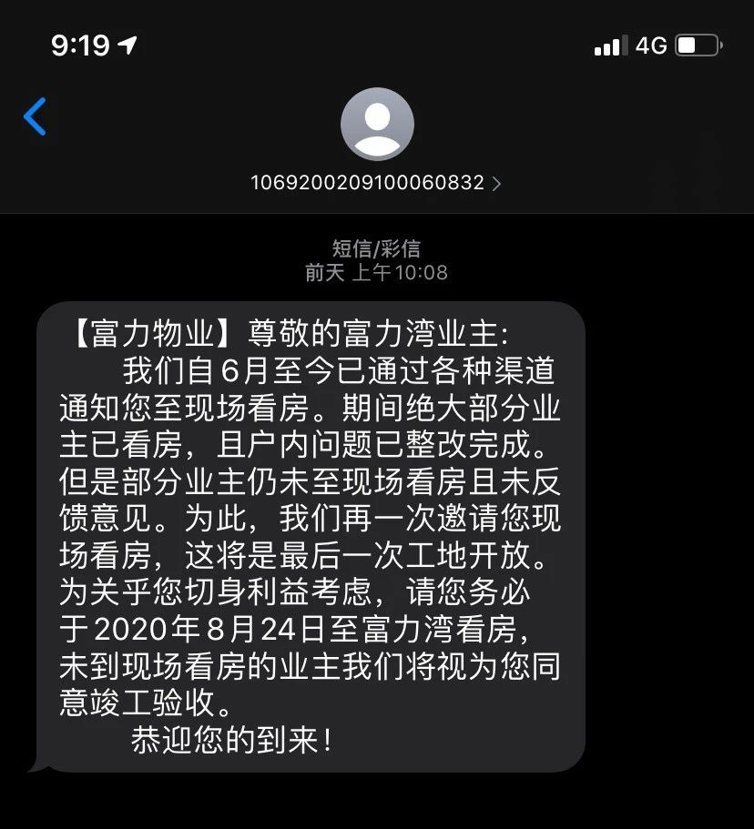 另外,有業(yè)主表示在近幾天收到了太原富力灣的短信通知,其內(nèi)容是告知業(yè)主務(wù)必在第四次工地開放日(8月24日,星期一)前往樓盤看房,未到現(xiàn)場看房的業(yè)主將視為同意竣工驗收。