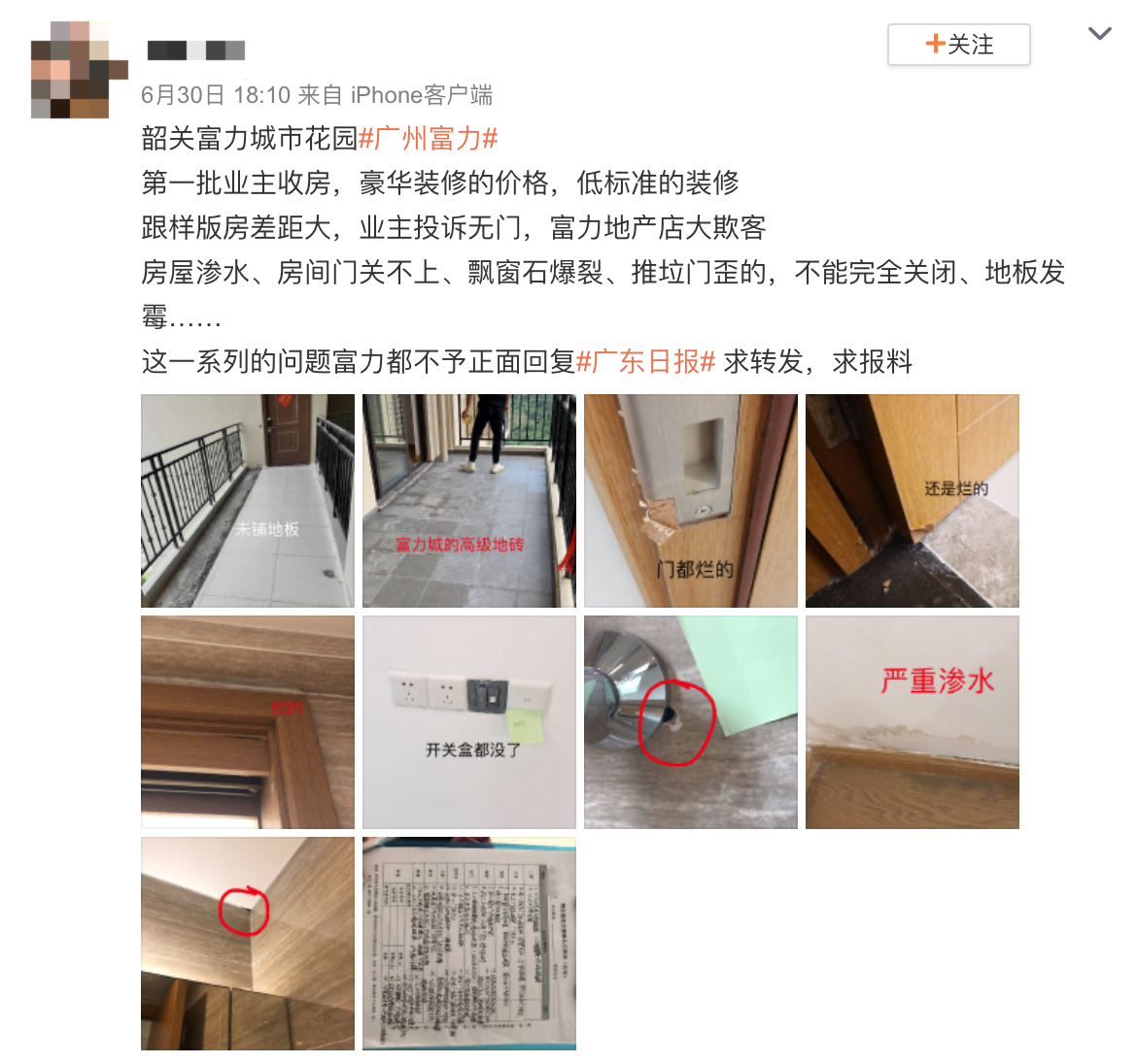 此外,據(jù)《消費者報道》不完全統(tǒng)計,本刊僅通過微博平臺用關(guān)鍵詞進(jìn)行檢索,發(fā)現(xiàn)在這三個月內(nèi)全國各地有13個富力地產(chǎn)的樓盤因房屋質(zhì)量問題被業(yè)主投訴。投訴的主要問題為墻面滲水漏水、墻體墻面粗糙或開裂、吊頂脫落等。