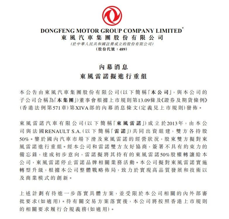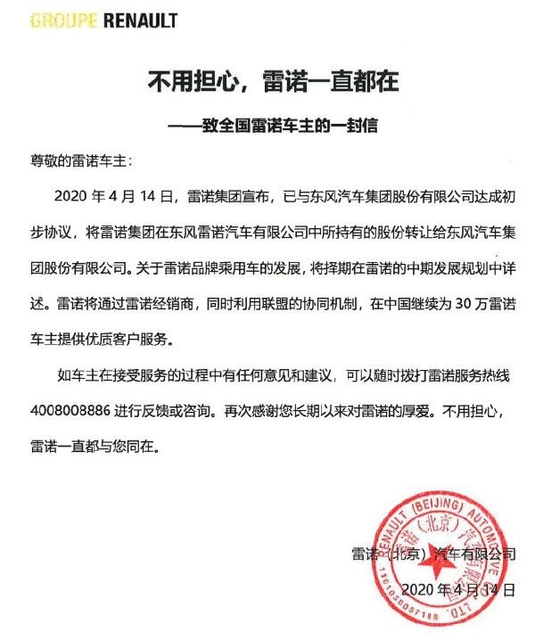 2020年4月14日,東風(fēng)汽車集團(tuán)股份有限公司(以下簡稱“東風(fēng)汽車”)發(fā)布公告,宣布雷諾將其持有的東風(fēng)雷諾50%股權(quán)轉(zhuǎn)讓給東風(fēng)汽車。當(dāng)天,雷諾(北京)汽車有限公司發(fā)布題為《不用擔(dān)心,雷諾一直都在》的致車主信,表示會繼續(xù)為30萬車主提供售后服務(wù)。