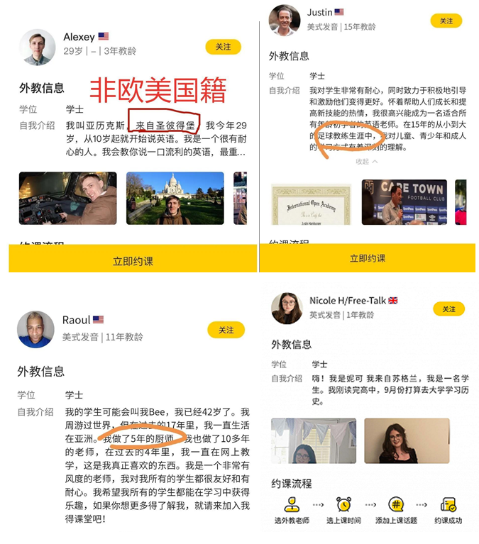 丁欣告訴記者,兩種課的外教資質不一樣,口語精靈課相比起主修課,老師比較“雜”,有些來自于非英語的國家,有些來自于教師以外的行業(yè),有教練、廚師,甚至還有剛畢業(yè)的高中生。在丁欣看來,這些人士應該不具備教學資格,或缺乏教學經驗。