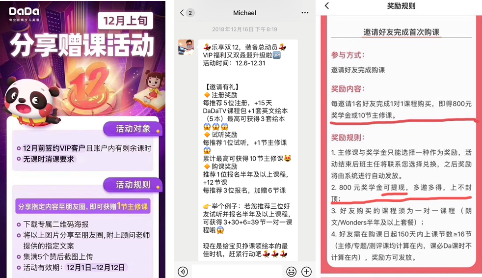 被“升級”為口語精靈課的主修課是哪些課程呢?丁欣稱,在會員期間,噠噠英語經常有分享贈課等活動,如每月分享朋友圈,符合條件的贈送一節(jié)主修課,推薦朋友購課贈十節(jié)主修課等。這些活動時常出現在噠噠英語銷售顧問的朋友圈、微信對話里。據悉,很多家長用戶都積極參加了這些活動以獲得主修課,丁欣表示,她也通過推薦朋友購課獲得了許多節(jié)主修課贈課。