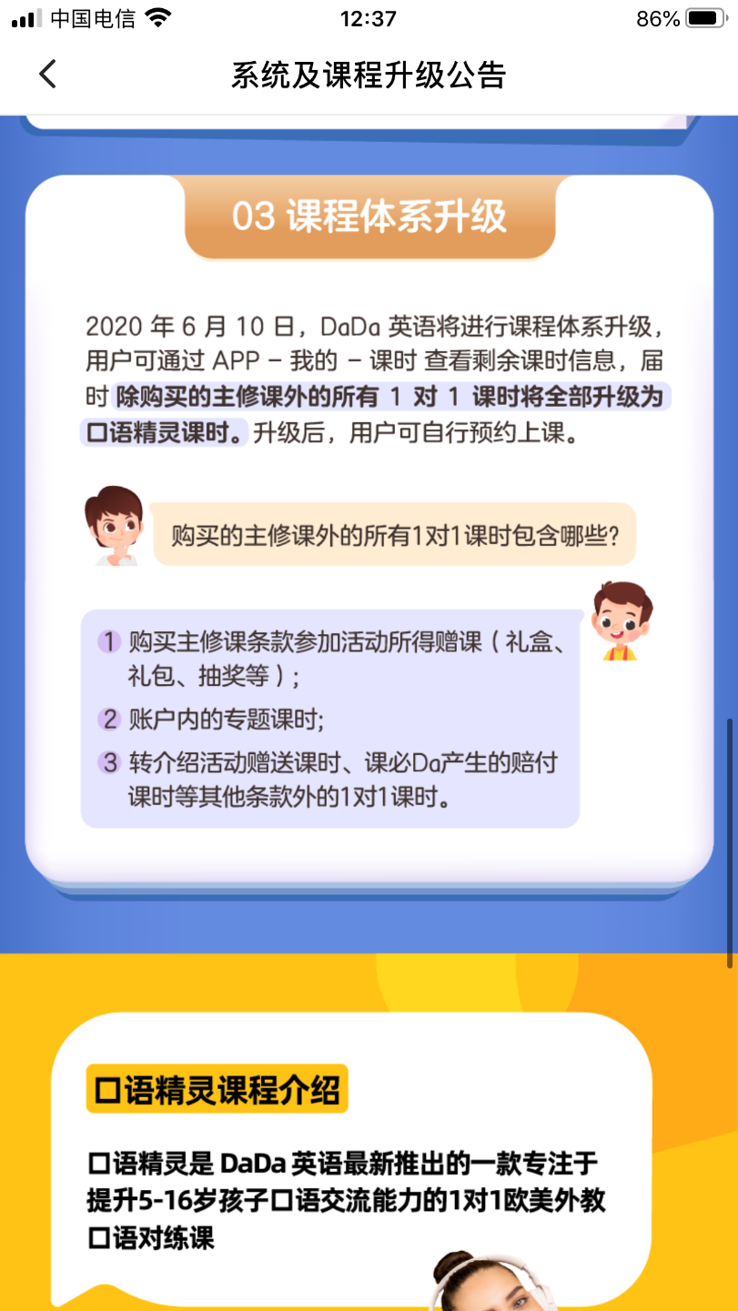 “升級”的最大變化之一,就是“除購買的主修課外的所有一對一課時”,都“升級”為口語精靈課,而課時長度也由原來的30分縮短為25分鐘。