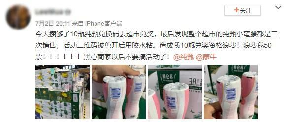 近日,《消費(fèi)者報(bào)道》了解到,不少網(wǎng)友在購(gòu)買(mǎi)蒙牛純甄小蠻腰后發(fā)現(xiàn)其存在瓶標(biāo)背面的二維碼破損、已被使用等問(wèn)題,甚至有網(wǎng)友表示通過(guò)掃描二維碼獲得“再來(lái)一瓶”的獎(jiǎng)勵(lì)到線下指定門(mén)店兌換時(shí)卻發(fā)現(xiàn)無(wú)法兌換,認(rèn)為兌換活動(dòng)形同虛設(shè),欺騙消費(fèi)者。