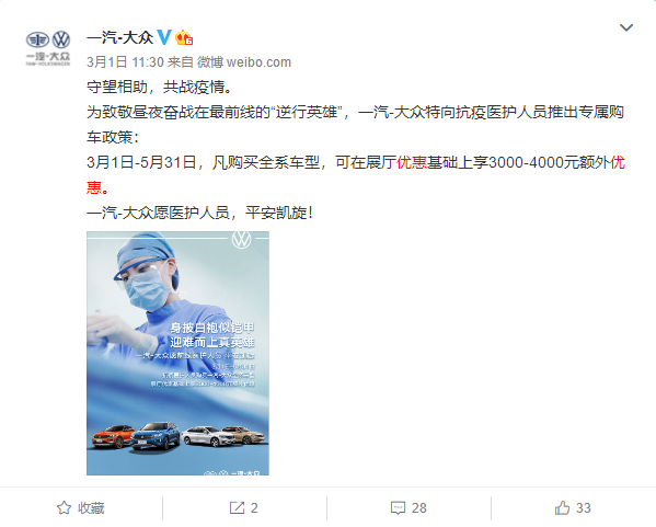 ▲一汽-大眾推出的醫(yī)護(hù)人員專屬優(yōu)惠活動(dòng)(來源:微博@一汽-大眾)