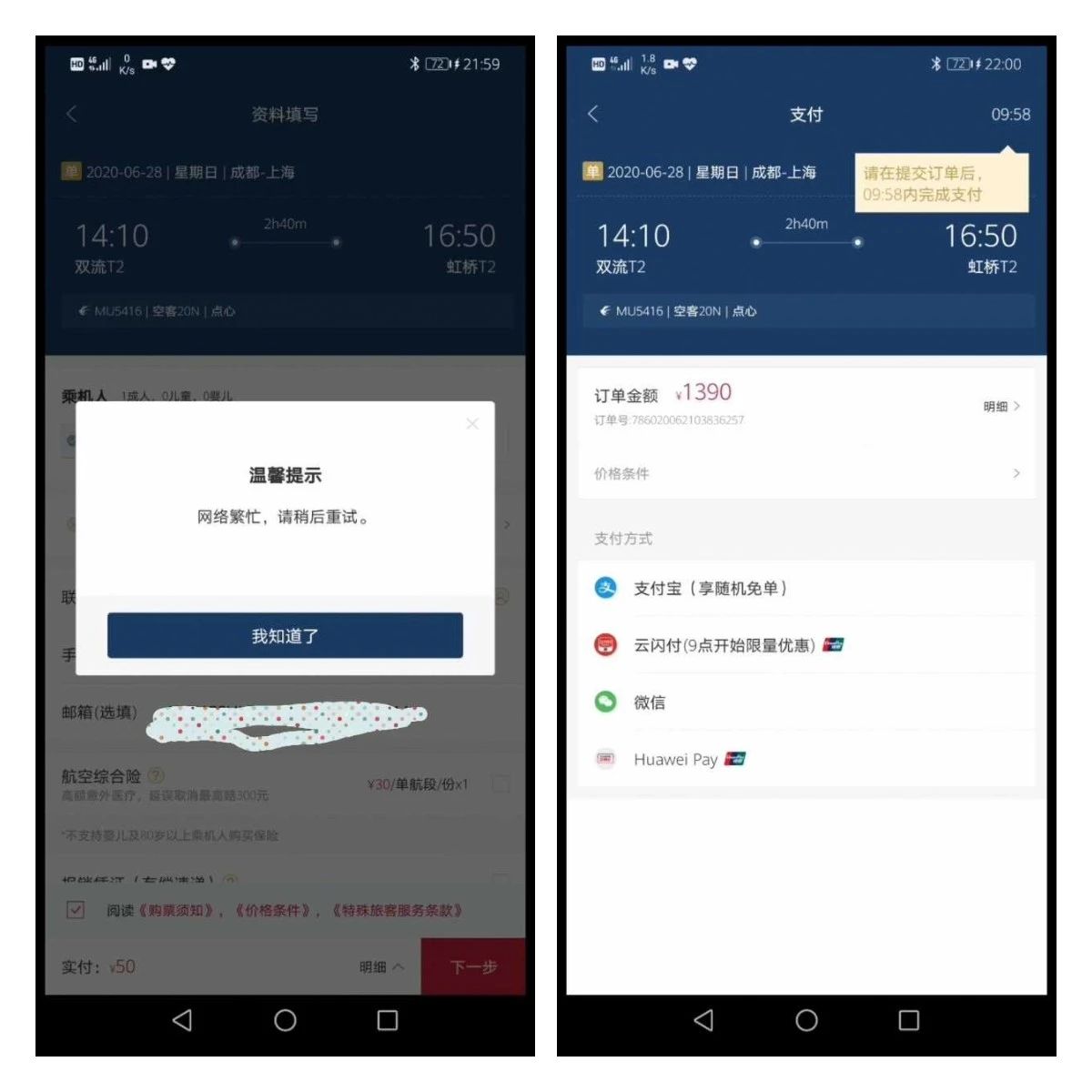 這位用戶給《消費者報道》提供了兩張相隔1分鐘的截圖,左圖使用“隨心飛”兌票只需支付機(jī)場建設(shè)費50元,但這位用戶表示自己嘗試兌票十幾次,均顯示“網(wǎng)絡(luò)繁忙”,一直無法跳轉(zhuǎn)到支付頁面;而右圖是同一航班按常規(guī)流程來購票,可直接跳轉(zhuǎn)到1390元付款界面。他補(bǔ)充道,這樣的情況在多個航班都存在,尤其在顯示經(jīng)濟(jì)艙余票緊張的情況下,兌換“隨心飛”基本都顯示網(wǎng)絡(luò)繁忙。