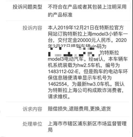 ▲有Model 3車主向市場監(jiān)督部門投訴自動駕駛芯片“簡配”