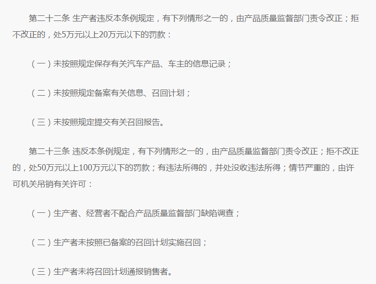 以汽車產(chǎn)品為例,根據(jù)《缺陷汽車產(chǎn)品召回管理條例》相關(guān)規(guī)定,未按規(guī)定提交有關(guān)召回報告的,由主管機關(guān)責(zé)令改正,拒不改正的,處5萬元以上20萬元以下的罰款。生產(chǎn)者、經(jīng)營者不配合產(chǎn)品質(zhì)量監(jiān)督部門的缺陷調(diào)查,生產(chǎn)者未按已備案的召回計劃實施召回或者將召回計劃通報銷售者的處50萬元以上100萬元以下的罰款。