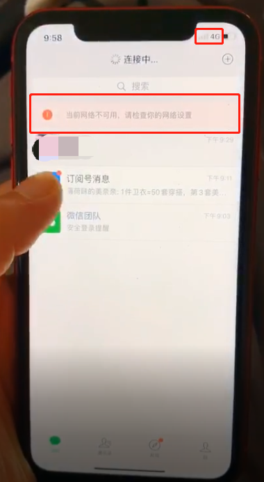 郭小姐發(fā)現(xiàn),打開手機(jī)的網(wǎng)絡(luò),發(fā)現(xiàn)并不能上網(wǎng),微信頁(yè)面顯示網(wǎng)絡(luò)不可用。手機(jī)右上角顯示具有4G網(wǎng)絡(luò),不過(guò)手機(jī)信號(hào)強(qiáng)度卻顯示為空格。