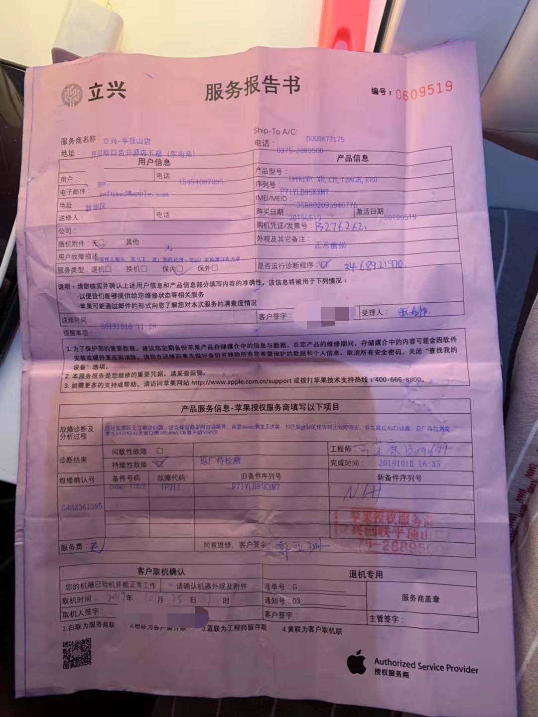 近日,河南許昌的郭小姐向本刊報(bào)料,稱自己的iPhone XR手機(jī)在購(gòu)買后半年內(nèi)的時(shí)間里一直存在無(wú)信號(hào)、不能上網(wǎng)的故障,且維修三次后故障依舊存在。5000多元的新手機(jī),現(xiàn)在卻成為“磚頭”?