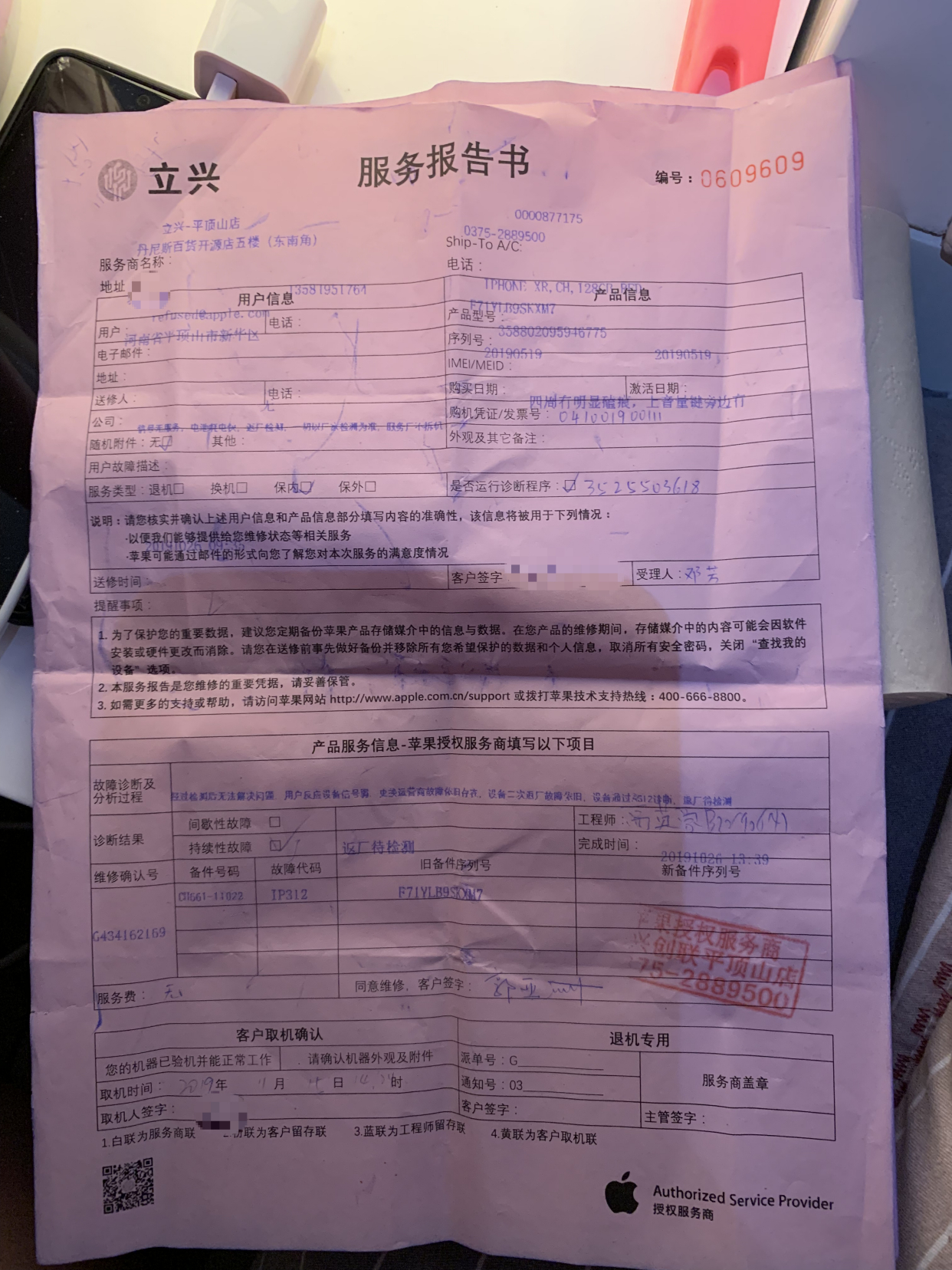 “我花了5000多元,感覺(jué)買了一臺(tái)廢機(jī)器回來(lái)?!睘榱耸故謾C(jī)恢復(fù)正常,郭小姐多次去到離自己最近的、位于平頂山市的蘋果授權(quán)服務(wù)商對(duì)手機(jī)進(jìn)行維修。雖然前后一共返廠維修了3次,不過(guò)都沒(méi)有找到故障的原因和解決辦法。