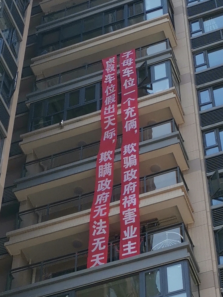 12月6日上午,本刊來到位于天河區(qū)悅景路的廣州招商雍華府一期小區(qū)。早上的小區(qū)人流稀少,不過掛在陽臺(tái)外面的一些橫幅引起了本刊的注意,上面印有“子母車位一個(gè)充倆,欺騙政府禍害業(yè)主”“虛假車位假出天際,欺瞞政府無法無天”等字樣。