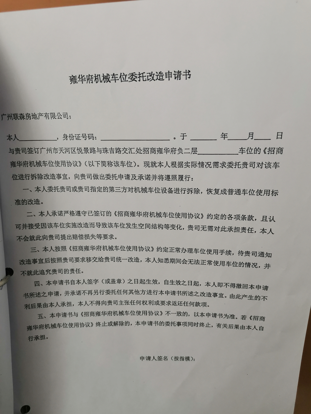 馬先生表示,在業(yè)主和開發(fā)商產(chǎn)生糾紛期間,開發(fā)商采用多種手段讓業(yè)主妥協(xié),其中就包括要求業(yè)主簽署一份“機(jī)械車位委托改造申請(qǐng)書”,該文件顯稱業(yè)主同意對(duì)機(jī)械車位設(shè)備進(jìn)行拆除并恢復(fù)成普通車位?!叭绻灹诉@份協(xié)議,車位數(shù)量不符合要求就是業(yè)主的責(zé)任了?!瘪R先生表示這是開發(fā)商在“甩鍋”。