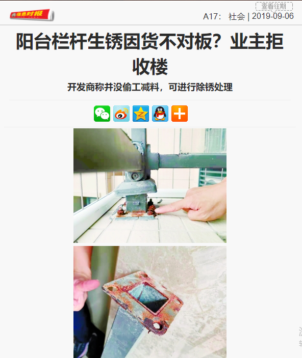 ▲信息時(shí)報(bào)曾報(bào)道招商雍華府陽臺(tái)欄桿生銹