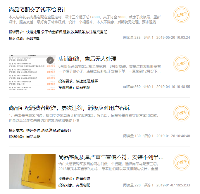 數(shù)量過多的加盟店和經(jīng)銷商,使不小家居定制企業(yè)的門店徒有大品牌的虛名,卻沒有相應的高質(zhì)量產(chǎn)品和服務。在聚投訴和黑貓投訴等消費投訴平臺上,關于裝修公司產(chǎn)品存在質(zhì)量問題、設計與實體不符、裝修人員不執(zhí)行約定工期、經(jīng)銷商跑路的投訴比比皆是: