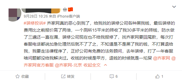 另外一家互聯(lián)網(wǎng)裝修平臺企業(yè)齊家網(wǎng)也不能獨善其身,多位網(wǎng)友投訴齊家網(wǎng)推薦的裝修公司產(chǎn)品質(zhì)量低下、不履行裝修合同,甚至卷款跑路。
