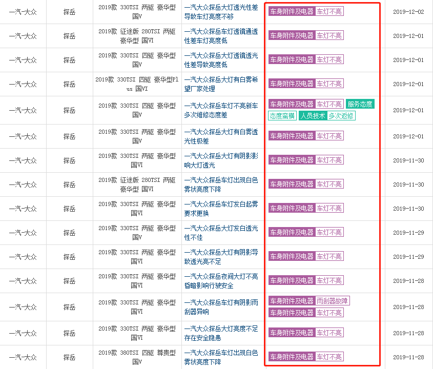▲車質(zhì)網(wǎng)上有多條關(guān)于探岳汽車車燈亮度不足的投訴(來源:車質(zhì)網(wǎng))