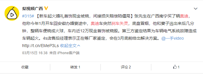 另外,奧迪Q5L的“姐妹車型”奧迪Q5也屢因質(zhì)量問題被投訴,其中剎車失靈問題成為奧迪Q5投訴的“重災(zāi)區(qū)”,有車主甚至因為剎車失靈而遭遇車禍并造成人員受傷。