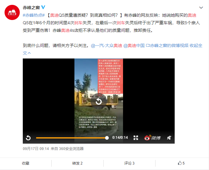 37萬奧迪Q5L提車5天就剎車失靈?4S店:汽車無質(zhì)量問題