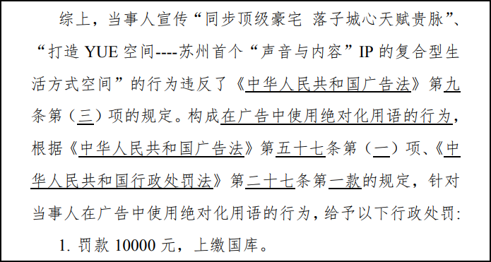 根據(jù)蘇州市虎丘區(qū)市場監(jiān)督管理局2019年3月29日公布的行政處罰決定書顯示,其在微信公眾號宣傳“同步頂級豪宅 落子城心天賦貴脈”、“打造 YUE 空間----蘇州首個“聲音與內(nèi)容”IP 的復(fù)合型生活方式空間”沒有相關(guān)依據(jù),構(gòu)成在廣告中使用絕對化用語的行為。