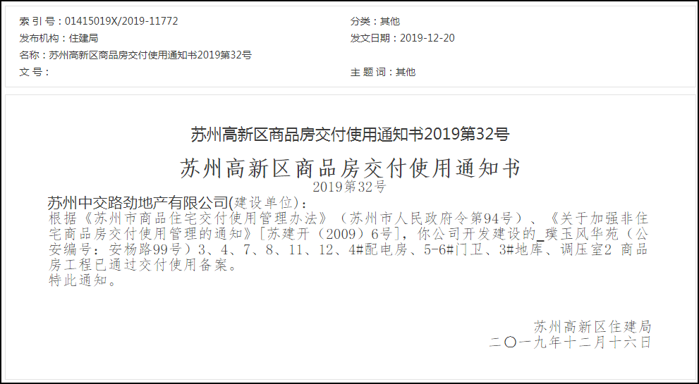 《消費(fèi)者報道》從蘇州高新區(qū)管委會官網(wǎng)查詢到,李先生所購買的房屋是在2019年12月16日通過交付使用備案。