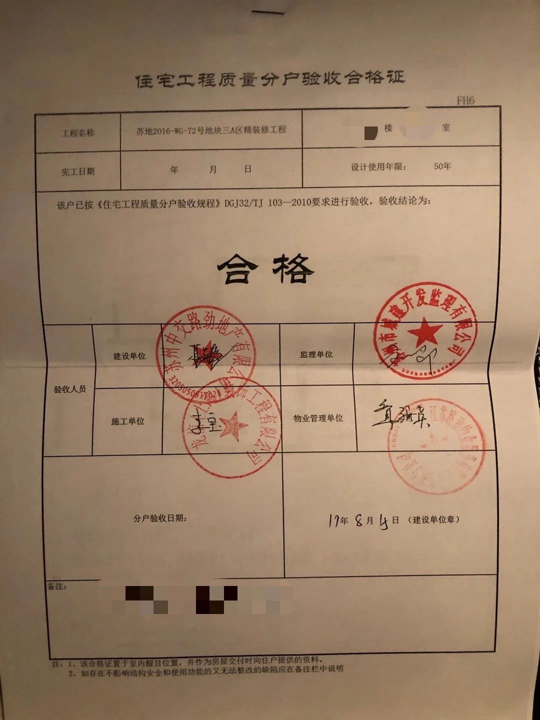 從李先生提供的“住宅工程質(zhì)量分戶驗(yàn)收合格證”顯示,該房屋的相關(guān)驗(yàn)收單位分別有建設(shè)單位蘇州中交路勁地產(chǎn)有限公司,監(jiān)理單位蘇州市城建開發(fā)監(jiān)理有限公司,施工單位龍信(上海)裝飾工程有限公司以及物業(yè)管理單位江蘇路勁物業(yè)服務(wù)有限公司蘇州分公司。