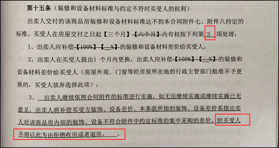 另外本刊還發(fā)現(xiàn),合同中還明確提到,即使開發(fā)商交付的商品房裝修和設(shè)備材料標(biāo)準(zhǔn)未達(dá)到合同相關(guān)標(biāo)準(zhǔn)時,買受人也不得以此為由拒絕收房或者退房。